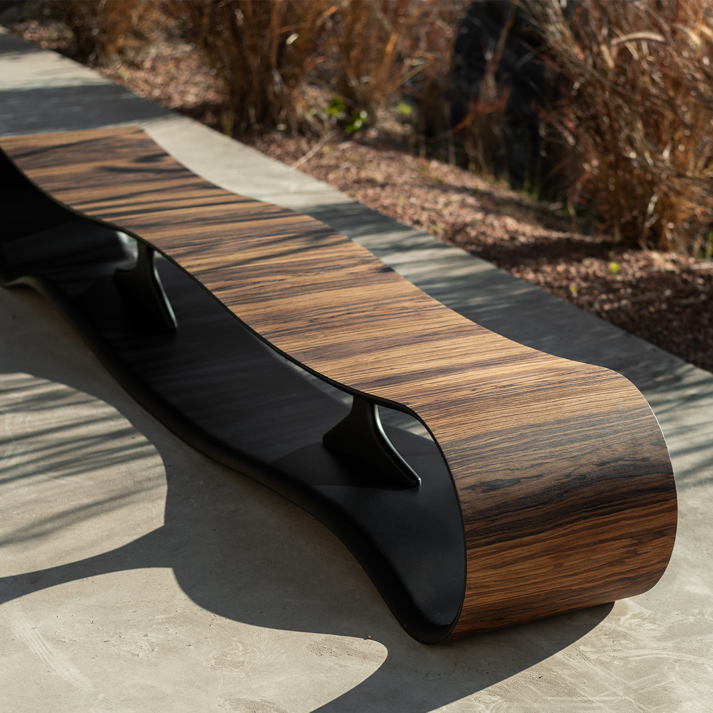 More of a sculpture than a seat. Its wooden, walnut shell judiciously juxtaposes its metallic matte interior. The undulating wave design can comfortably seat three. Equally at home in a gallery or your living room, the Belmont Bench is a work of art that commands attention through sheer presence alone.