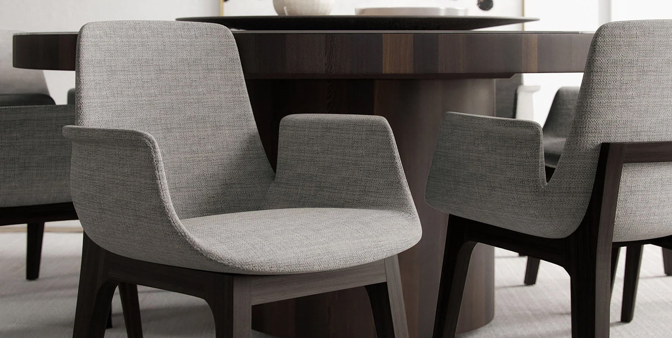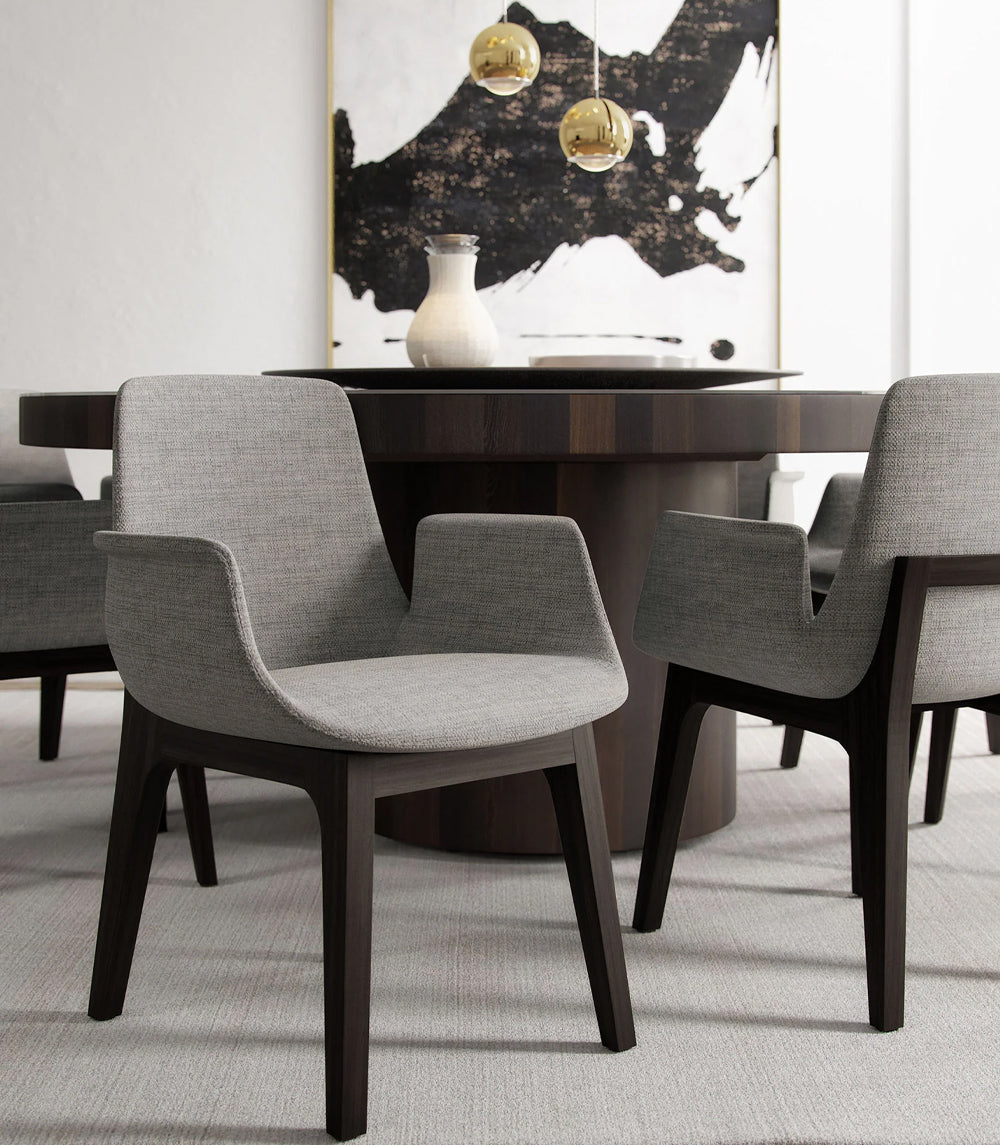A solid seared ash wood frame provides a sturdy foundation while offering a striking visual contrast. Its design is both stylish and supportive, making it as comfortable as it is eye-catching. Available as Side Chair or Arm Chair. Sold in pairs.