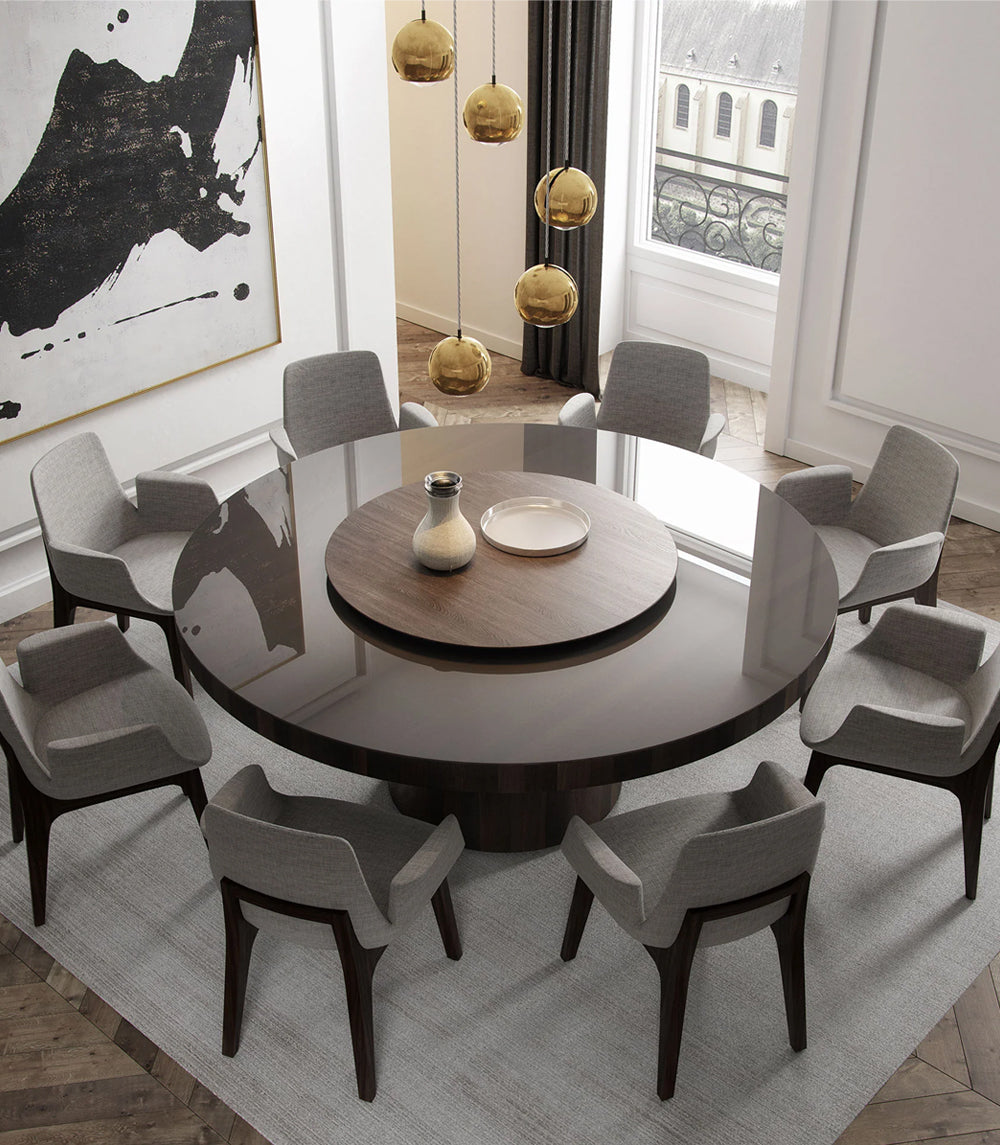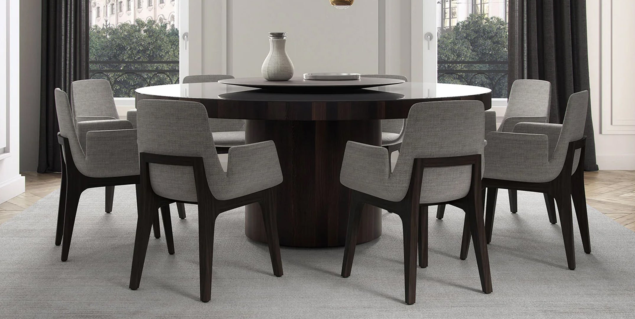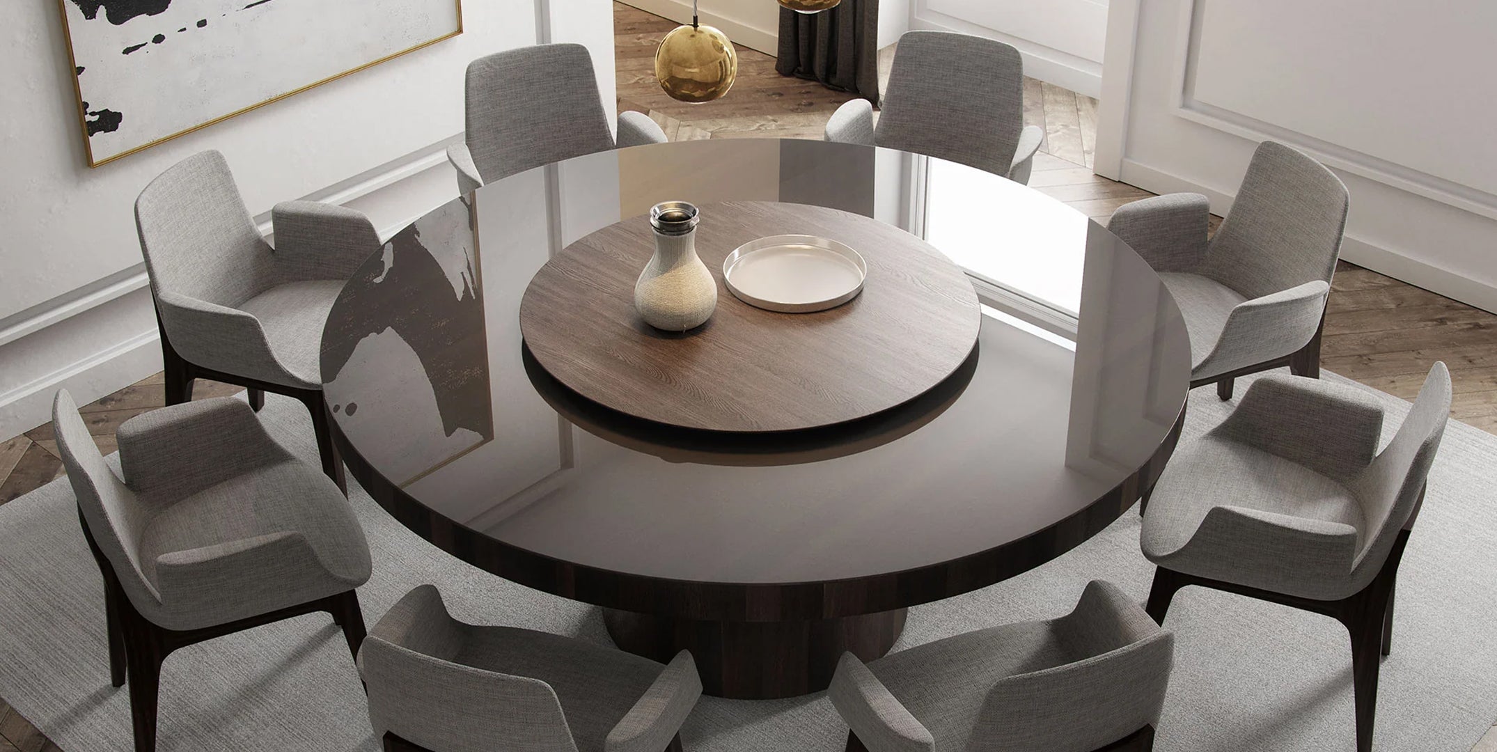 The Berkeley dining table represents clean, incisive design. The recessed pedestal base sits firmly underneath a solid round top. Brilliant underpainted glass adorns the surface creating a formal contemporary table. Seats 8-10 guests.