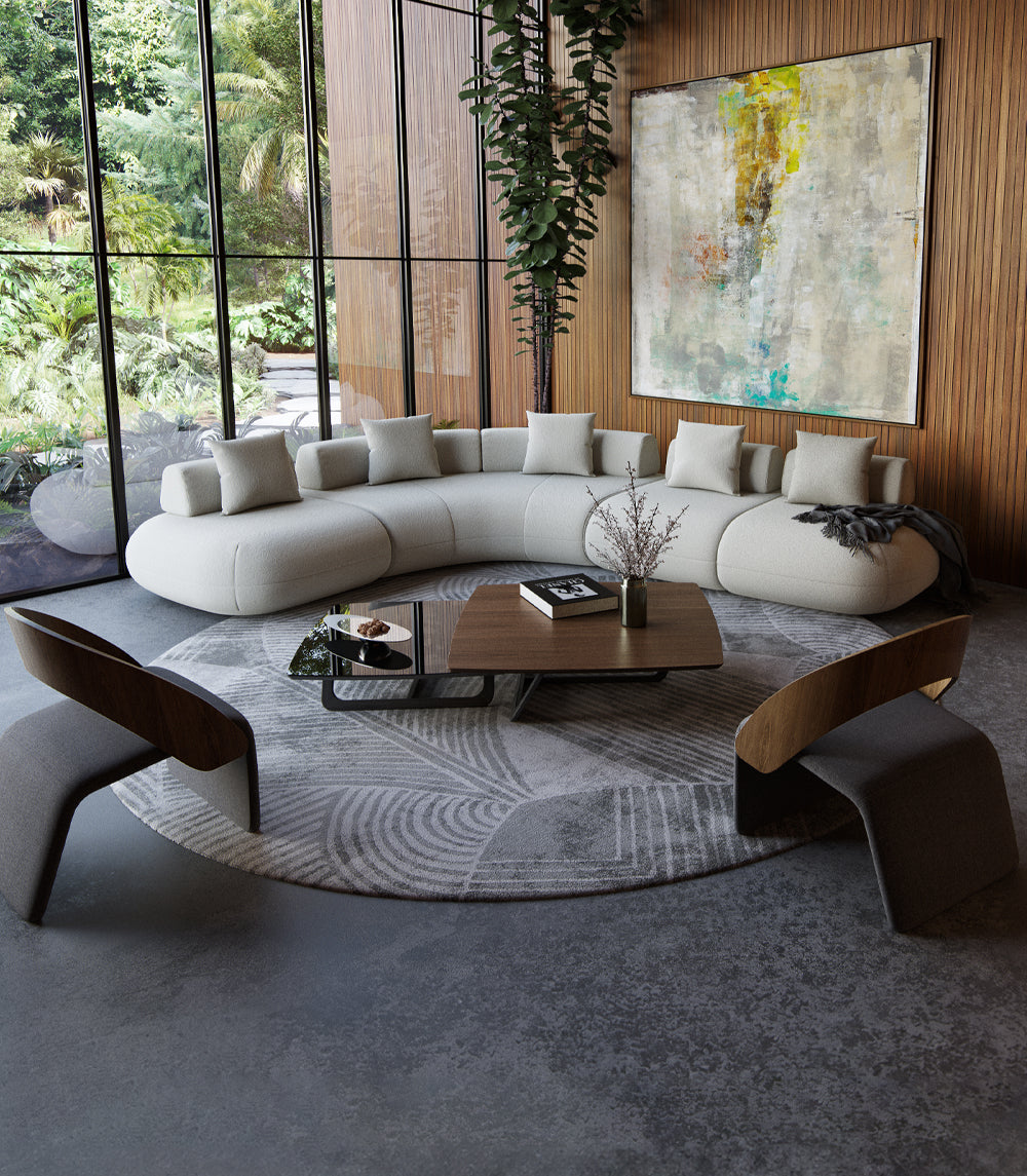 Upholstered in vanilla bouclé fabric for a sumptuous yet durable feel. Beautiful curves and fine tailoring are complemented by ultra-comfortable seating. The weighted back cushions are moveable and can be rearranged to suit your mood or preferred style.