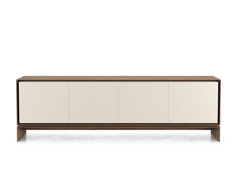 Its beveled edges, matte-lacquered cabinets, and a mitered wooden frame offer a balanced mix of sophistication and functional storage.
