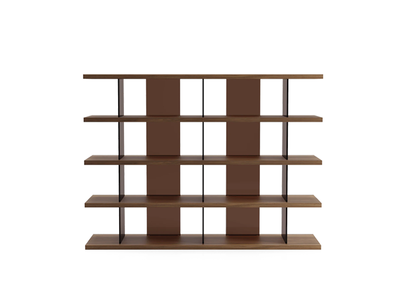 This design offers multi-tier shelving with wood veneers. Smoked glass columns add minimalist elegance for displaying books or decor.
