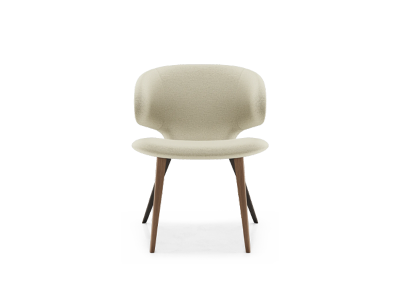 Seat in Eggshell Fabric, Back in Walnut, Legs in Walnut, Interior Legs in Cocoa Steel