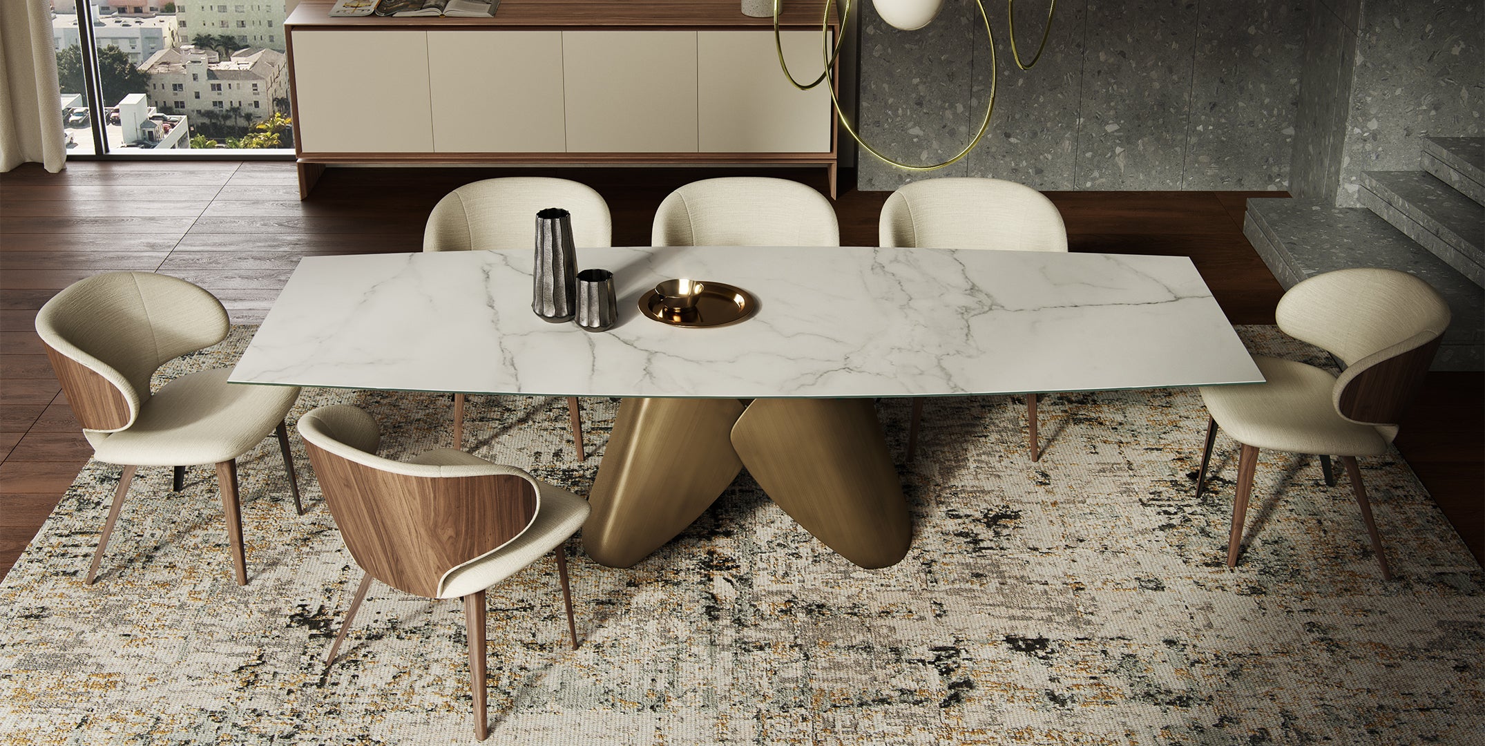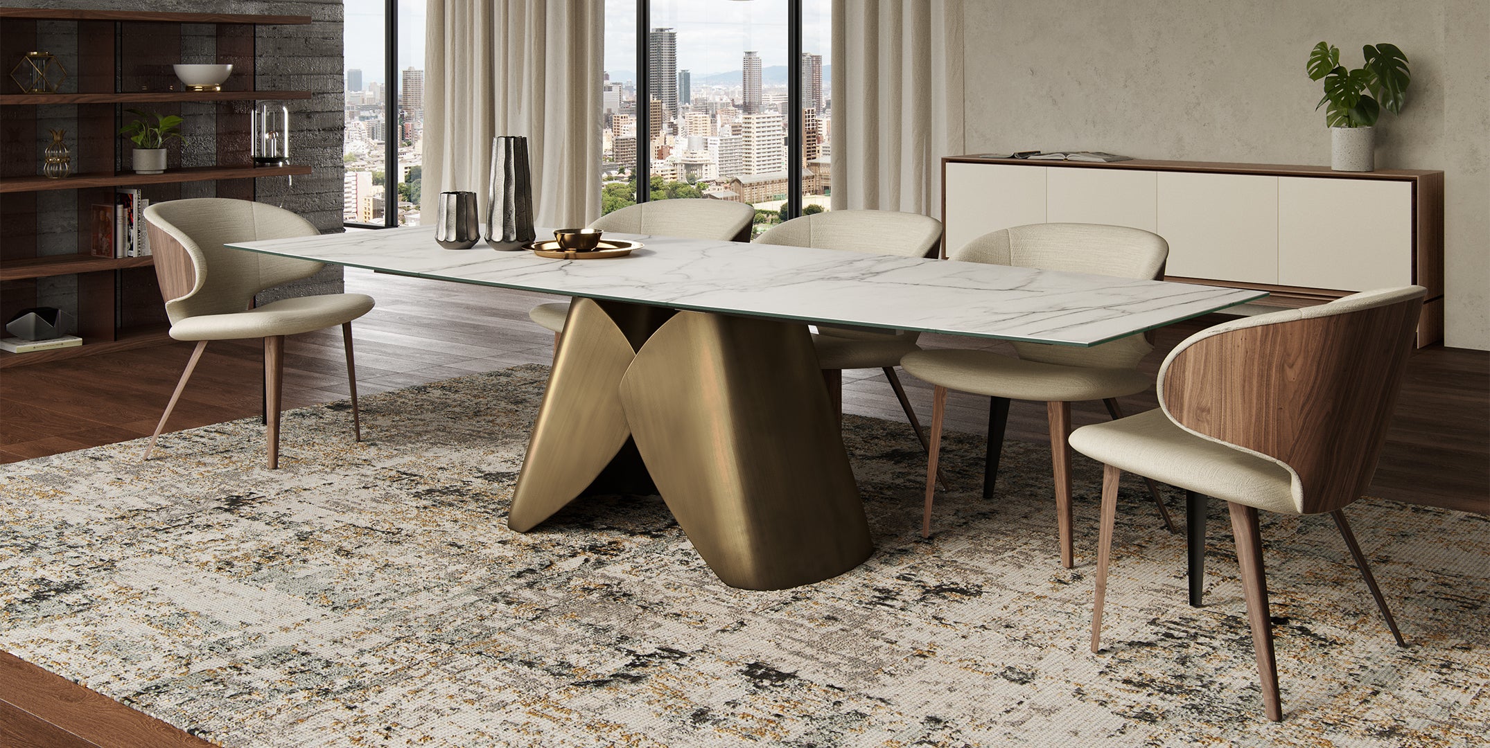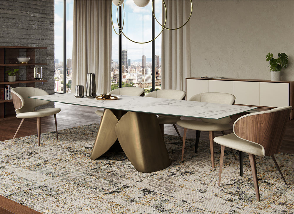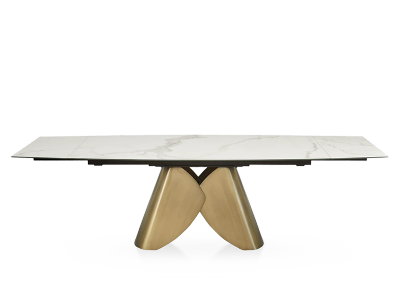 Elegance and durability with premium materials: a bronze base and marbled porcelain top. It seats 6 to 12 guests extending from 71" to 103".